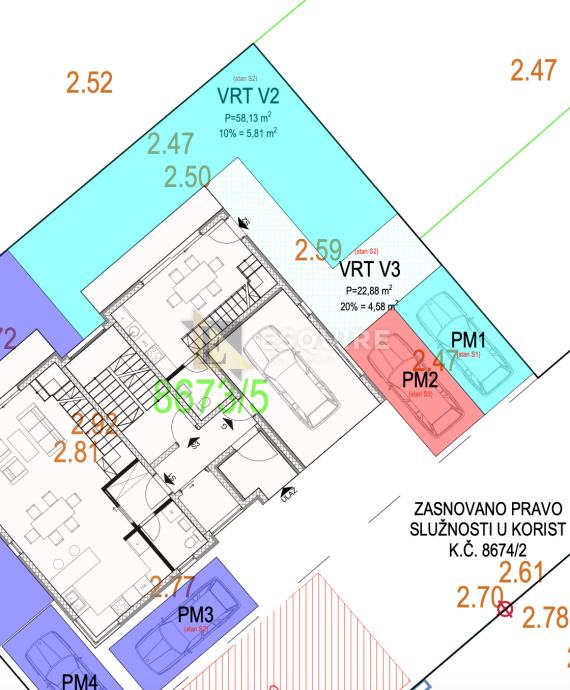 Stanu pripadaju dva parkirno mjesto (13,75 x 2m2) i vrt površine 81,01m2.