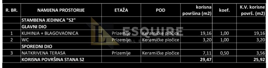 Ukupna bruto površina prizemlja: 29,47 m², netto površina: 25,92 m²