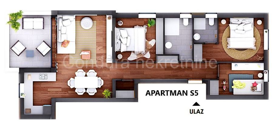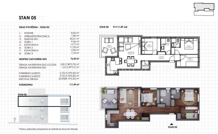Apartman S5 (trosoban) ima ukupnu neto korisnu površinu od 111,49 m² i sastoji se od: