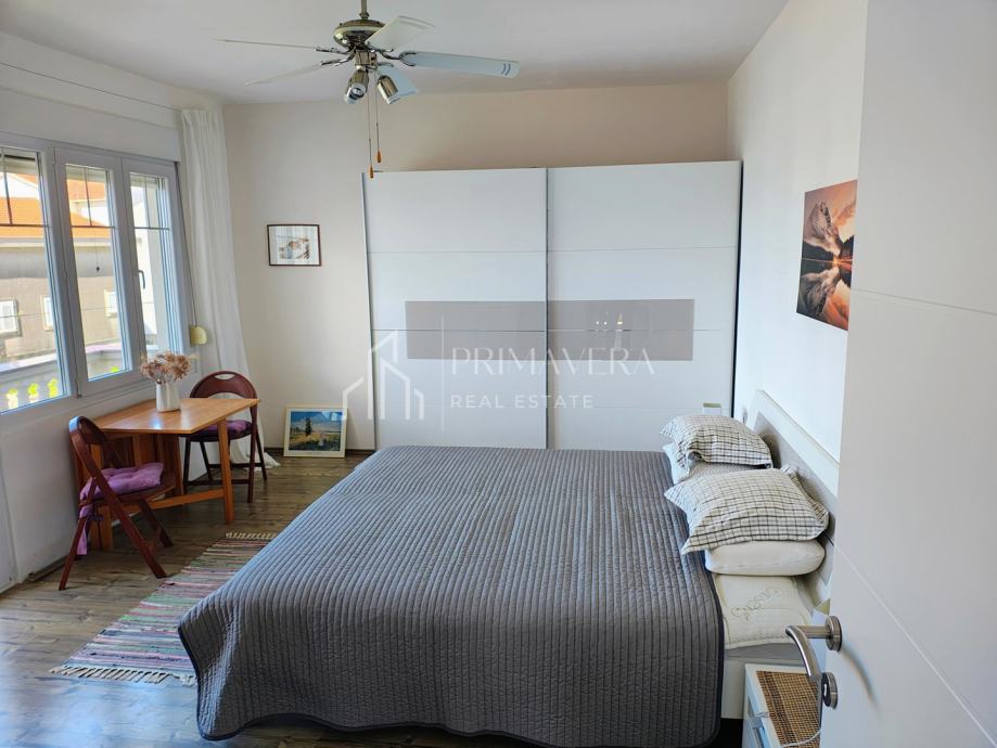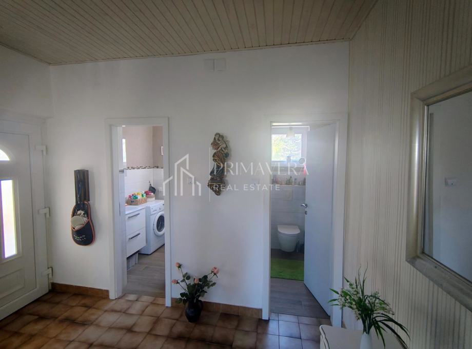 Na prizemlju kuće se nalazi stan koji sadrži prostrani hodnik, kupaonicu, wc, kuhinju s blagovaonicom koja je povezana s dnevnim boravkom, izlaz na terasu te jednu veliku spavaću sobu. Kat sadrži kuhinju, dnevni boravak, kupaonicu, zasebni wc, 3 veće spavaće sobe s balkonom i pogledom na more te 1 manju sobu. Potkrovlje sadrži spremište s mogućnošću uređenja te krovnu terasu s pogledom na more. 2022. godine promijenjeno je kompletno krovište, kupaonice, unutarnja vrata i pvc prozori te je obnovljena fasada. Nova kuhinja je ugrađena 2019. Stanovi su klimatizirani, a na prizemlju je ugrađena peć na kruta goriva. Kuća je potpuno namještena i prodaje se s namještajem.