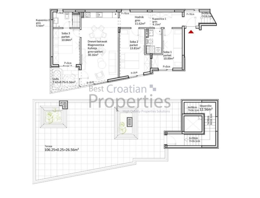 3 spavaće sobe | 2 kupaonice | privatna krovna terasa |hidromasažna kada