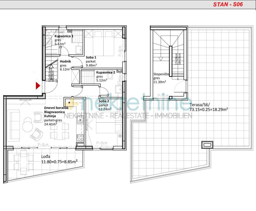Stanu pripada krovna terasa od 73,15 m2 i vanjsko parkirno mjesto 6 od 13,53 m2.