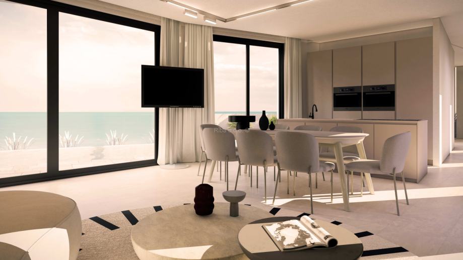 Na izvanrednoj lokaciji u Sukošanu, u prvom redu do mora, prodaje se moderna vila s bazenom i jacuzzijem, savršena za uživanje u luksuzu i miru dalmatinske obale.