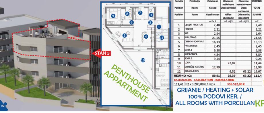 Penthouse je dodatno opremljen podnim grijanjem putem dizalice topline,