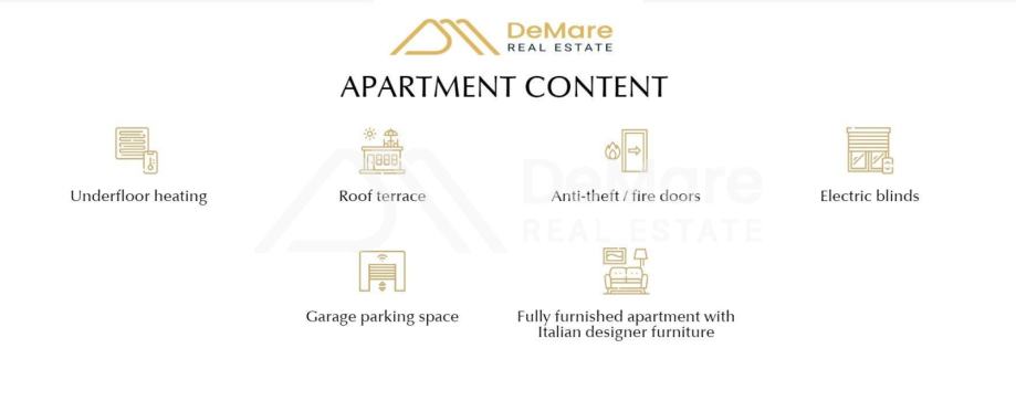 Stanu pripada krovna terasa sa prekrasnim pogledom na more i otoke, jedno garažno parkirno mjesto te jedno spremište.