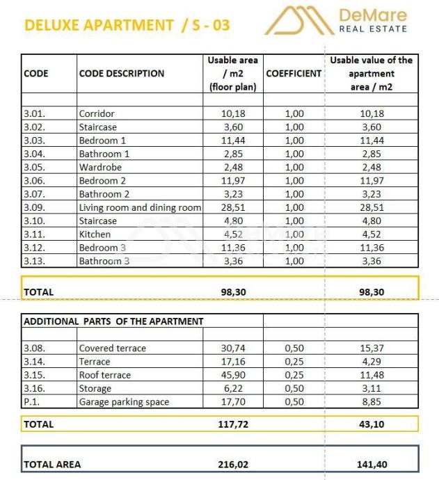 Ukupna korisna vrijednost površine stana s pripadcima iznosi 218 m2.