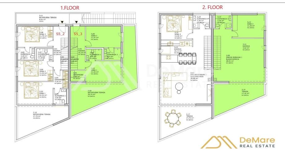 Stan se prostire na dvije etaže, na prvom i drugom katu zgrade te se sastoji od dnevnog boravka sa blagovaonicom, kuhinje, tri spavaće sobe, od kojih dvije imaju vlastitu kupaonicu, dodatne kupaonice, garderobe, hodnika i dvije terase (44 m2).