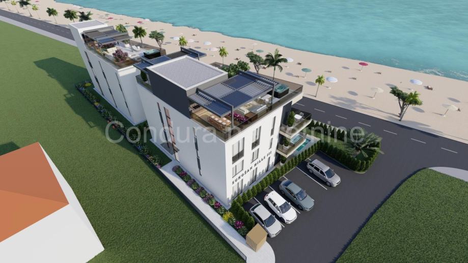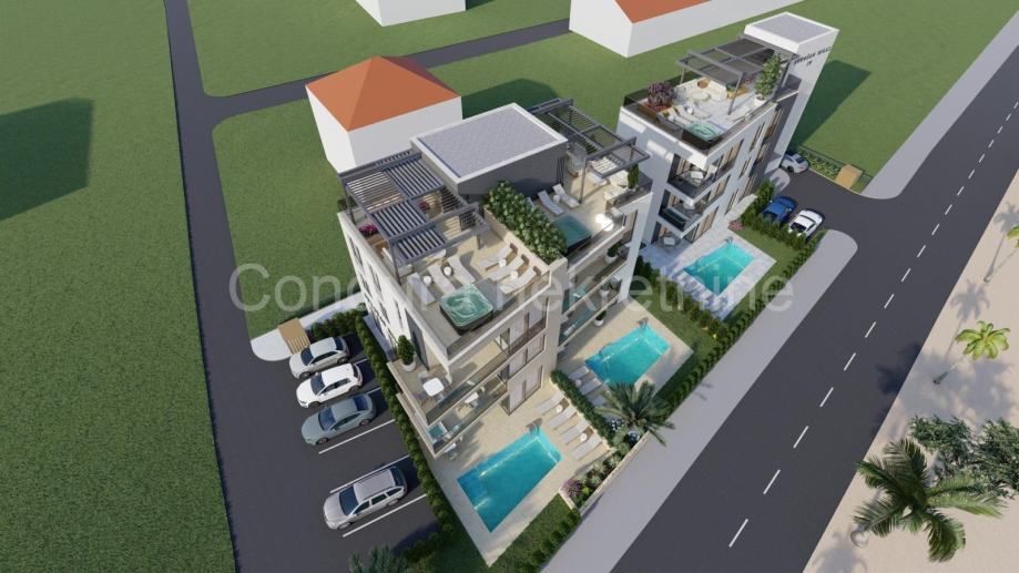 Projekt obuhvaća četiri moderne stambene zgrade smještene u prvom redu do mora, nudeći iznimnu razinu luksuza i udobnosti. Svaka zgrada sastoji se od 3 do 6 komfornih stambenih jedinica. Stanovi u prizemlju imaju vlastite privatne bazene, idealne za opuštanje u privatnosti vlastitog doma, dok penthousi raspolažu prostranim krovnim terasama s veličanstvenim pogledom na more i okolicu.