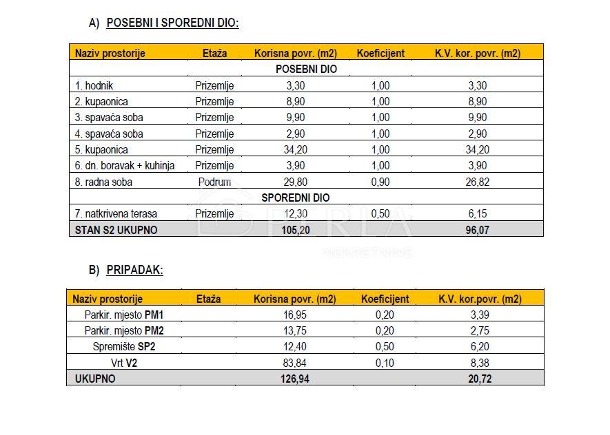 - 2 parking mjesta (16,95 m² i 13,75 m², netto površine 3,39 m² i 2,75 m²).