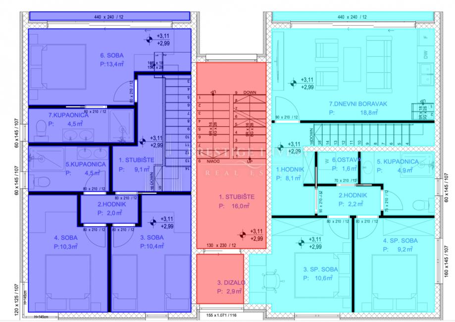 Stan je dvoetažan, i prostire se na dvije etaže, prizemlje i prvi kat. Na prvom katu se nalazi dnevni boravak s kuhinjom i wc-om. Unutarnjim stepenicama se ide na prvi kate gdje se nalaze tri spavaće sobe i dvije kupaonice.