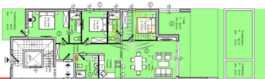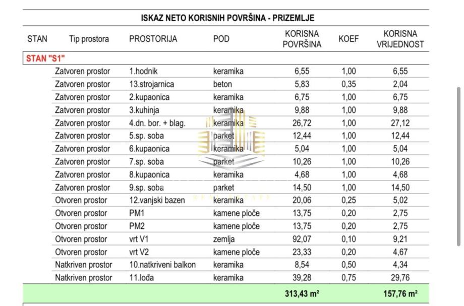 Stanu pripadaju i dva vanjska parkirna mjesta (svako površine 13,75 m²). Neto stambena površina iznosi 157,76 m², dok ukupna brutto površina iznosi 313,43 m².