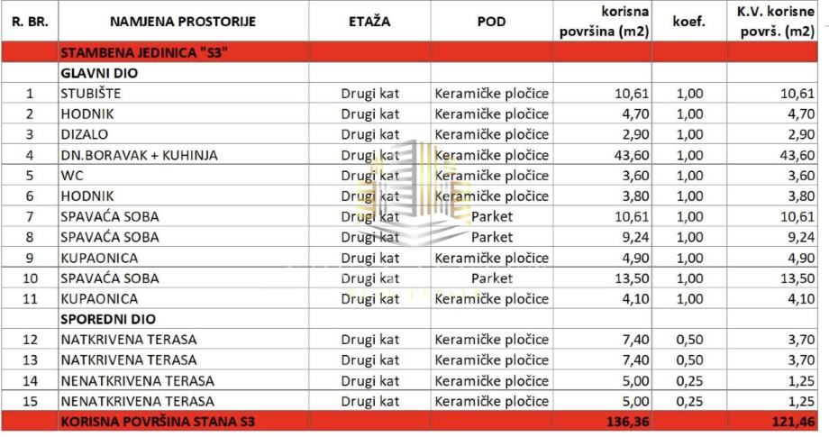 Stan se prostire na dvije etaže, ima neto površinu 216,51 m² (bruto 335,90 m²), a sastoji se od: