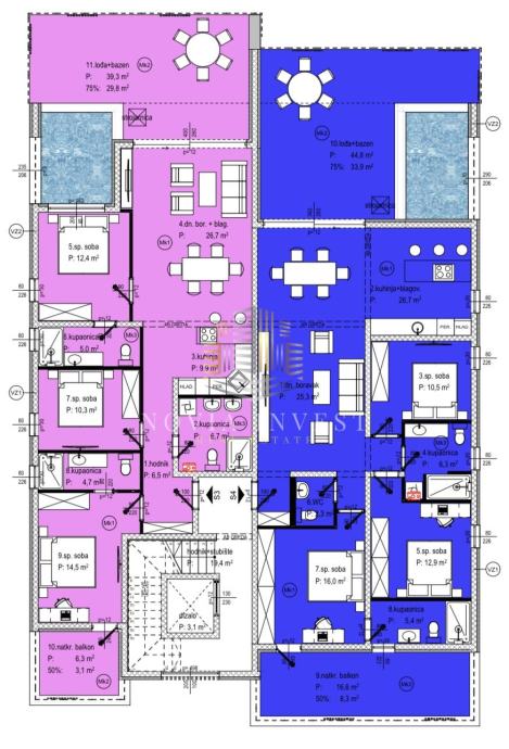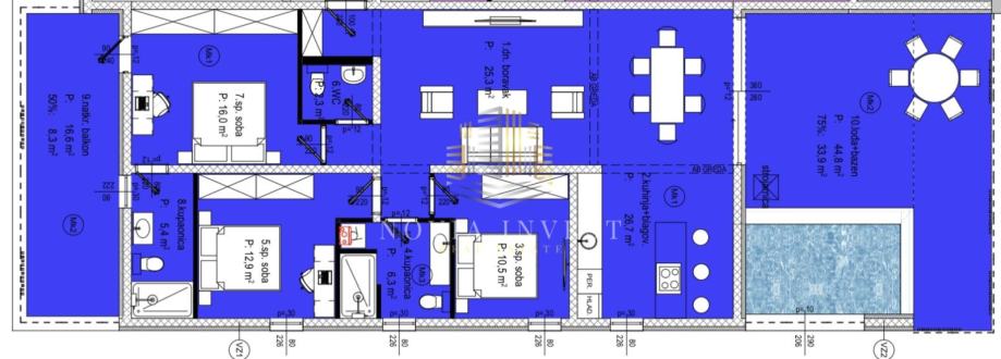 Ukupna neto površina stana s pripadcima iznosi 153,02 m², dok je bruto stambena površina 194,28 m².
