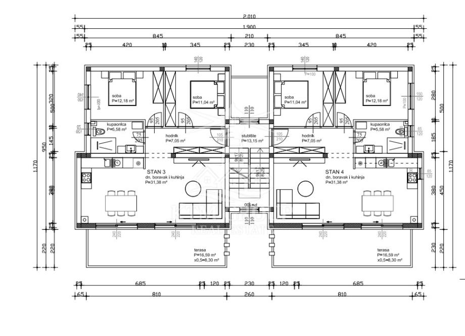 - spavaće sobe - površine 12,18 m2,