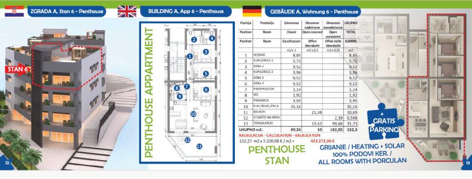 Prodaje se penthouse oznake S6 u novogradnji, zgrada A 50 m od mora. Stan je smješten na 2. katu zgrade sa pripadajućom krovnom terasom na 3. katu. Stan se sastoji od :