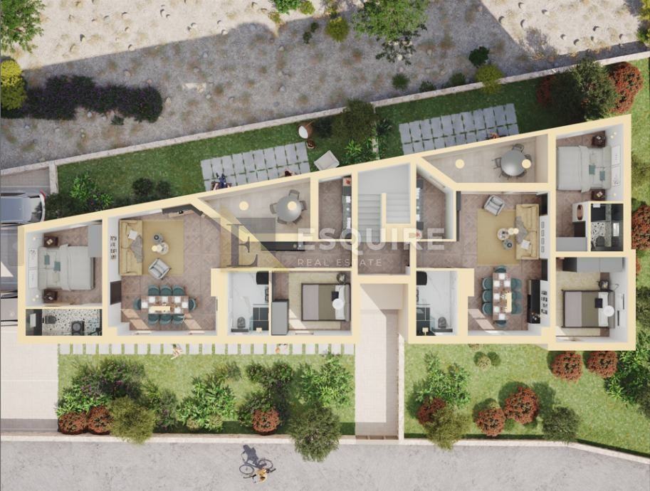 Prizemni stanovi imaju privatne vrtove, dok jedinice na drugom katu uživaju u prostranim krovnim terasama. Svakom stanu pripada vlastito parkirno mjesto.