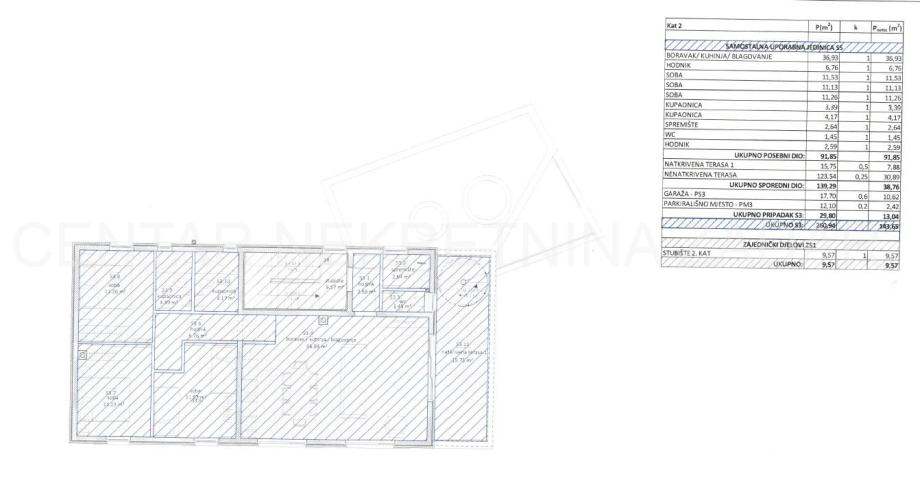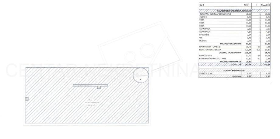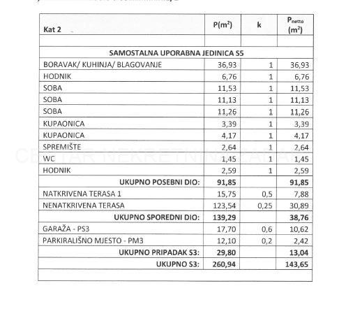 Površina mu je 91,85 m² i sastoji se od kuhinje s blagovaonom i dnevnim boravkom (40 m²), tri spavaće sobe (svaka od oko 11 m²), hodnika, dviju kupaonica, toaleta, predsoblja i spremišta. Jedna od soba ima svoju kupaonicu. Dnevni boravak je velikom staklenom stijenom odijeljen od južno orijentirane natkrivene terase površine 15,75 m² s koje se pruža pogled na more. S terase spiralne stepenice vode na krovnu terasu od 123,5 m² s panoramskim pogledom na more. Stanu još pripada prostrana garaža (17,7 m²) i jedno parkirno mjesto pa ukupna neto korisna površina stana iznosi 143,65 m².