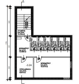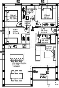 Sadržaj: 3 spavaće sobe, dnevni boravak s kuhinjom i blagovaonicom, dvije kupaonice, lođa, garaža, spremište