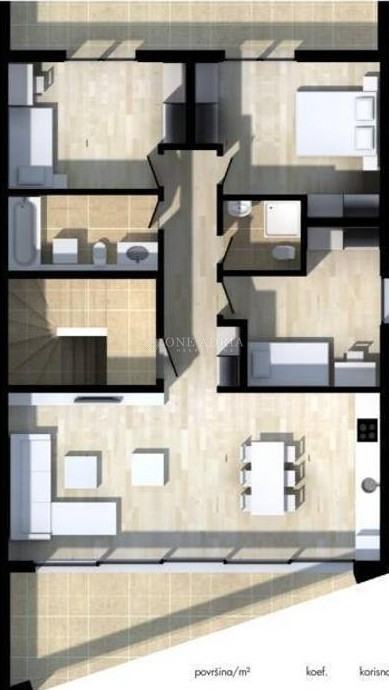 Sastoji se od prostranog dnevnog boravka povezanog s blagovaonicom i kuhinjom ukupne površine 37,62 m², tri spavaće sobe, kupaonice, dodatnog WC-a te ulaznog prostora s garderobom. Dodatnu vrijednost nekretnini daje vanjska terasa površine 11,55 m² s lijepim i otvorenim pogledom na more.
