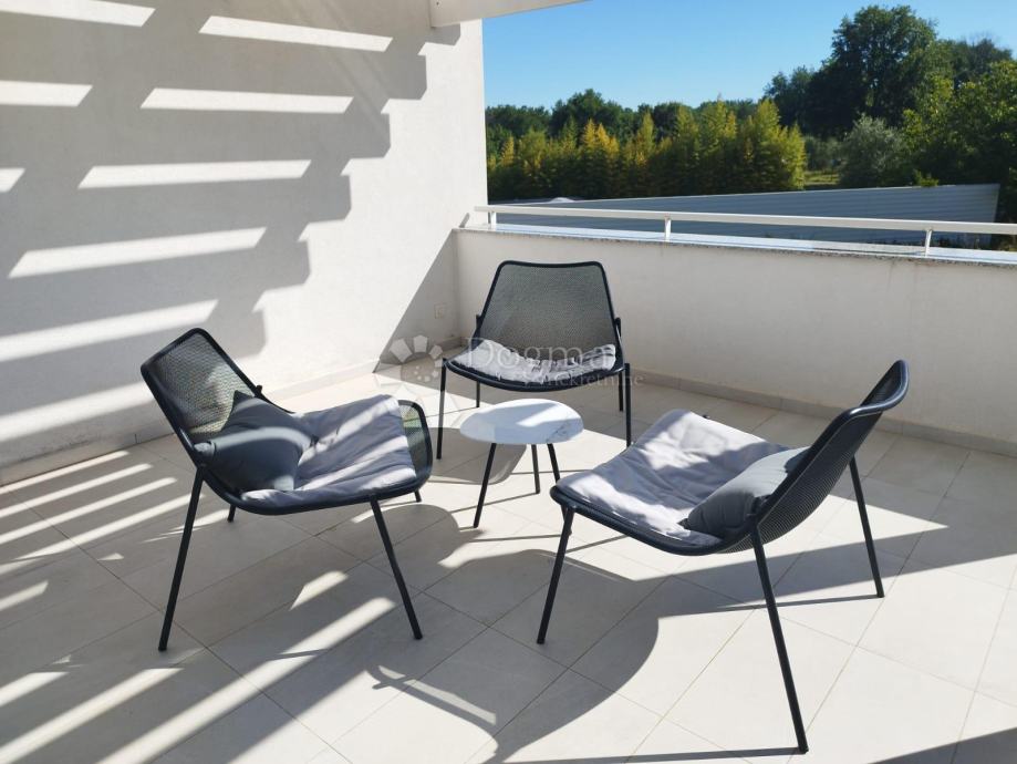 Iz dnevnog boravka izlazi se na veliku terasu, idealnu za ljetne večere na otvorenom, opuštanje uz čašu vina ili sunčanje kraj bazena koji pruža potpuni osjećaj luksuza i privatnosti. Na katu se nalazi i balkon, koji dodatno oplemenjuje doživljaj života u ovom domu.
