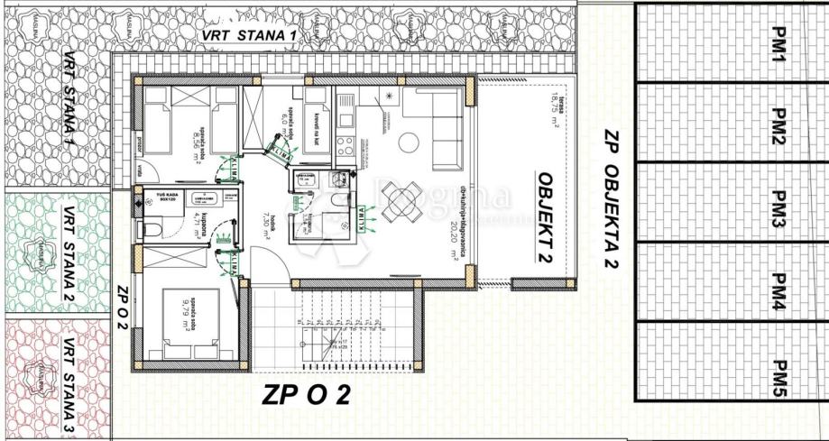Stan se nalazi na prizemlju zgrade od tri kata u kojoj je na svakom katu po jedan stan. Sastoji se od 3 spavaće sobe, 2 kupaonice od kojih je jedna spojena sa roditeljskom sobom, dnevni boravak spojen sa kuhinjom i blagovaonicom i terasom od 18,75 m. Ukupna kvadratura stana je 78,75 m2, te ima još 49 m2 vrta i 2 parkirna mjesta.