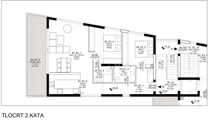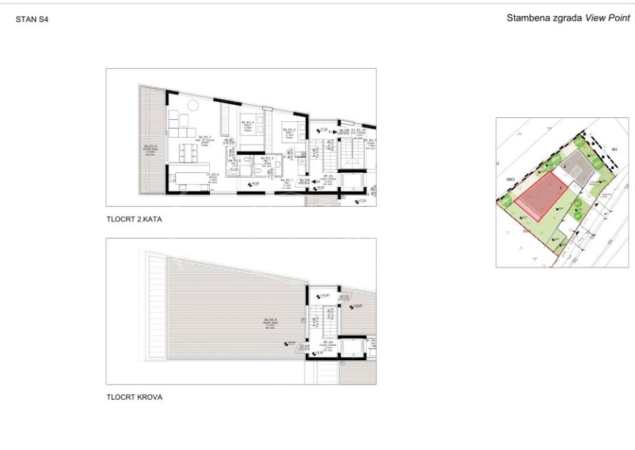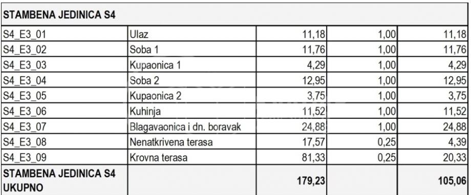 Ukupna površina stana iznosi 179,23 m2 – neto površina sa svim pripadcima iznosi 105,06 m2.