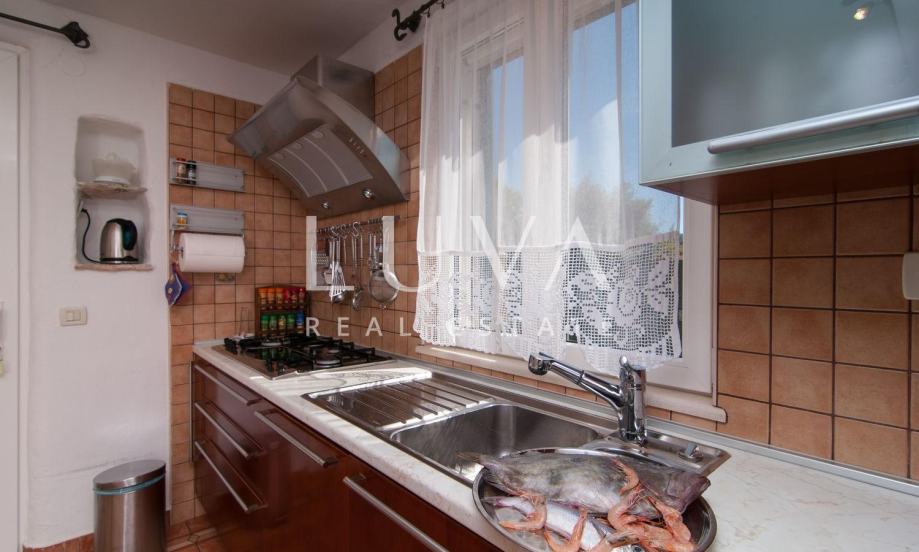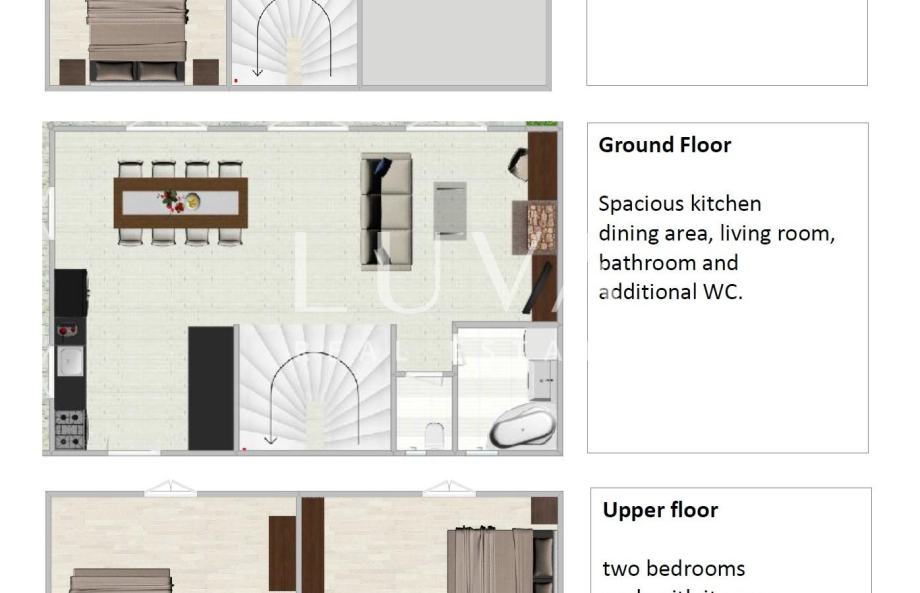 U prizemlju se nalazi prostran dnevni boravak s kuhinjom i blagovaonicom u otvorenom tlocrtu, savršen za opušteni boravak. Tu se nalaze i jedna kupaonica te dodatni odvojeni WC. Na prvom katu smještene su dvije spavaće sobe s bračnim krevetima, svaka s vlastitom kupaonicom. Po potrebi, u svaku sobu moguće je postaviti dodatni ležaj (dimenzije 90x200). Treća spavaća soba nalazi se u niskom prizemlju i vrlo je prostrana – opremljena je bračnim krevetom i kaučem na razvlačenje za dvije osobe.