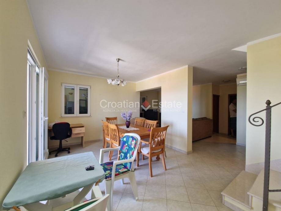 Stambene površina stana je 128 m2, a sastoji se od kuhinje s blagovaonicom i dnevnim boravkom, spavaće sobe ( lakom preinakom može se dobiti još jedna soba), toaleta, ostave i dvije lođe na jugu na donjoj etaži i dvije spavaće sobe, kupatila i dva južna balkona na gornjoj etaži.