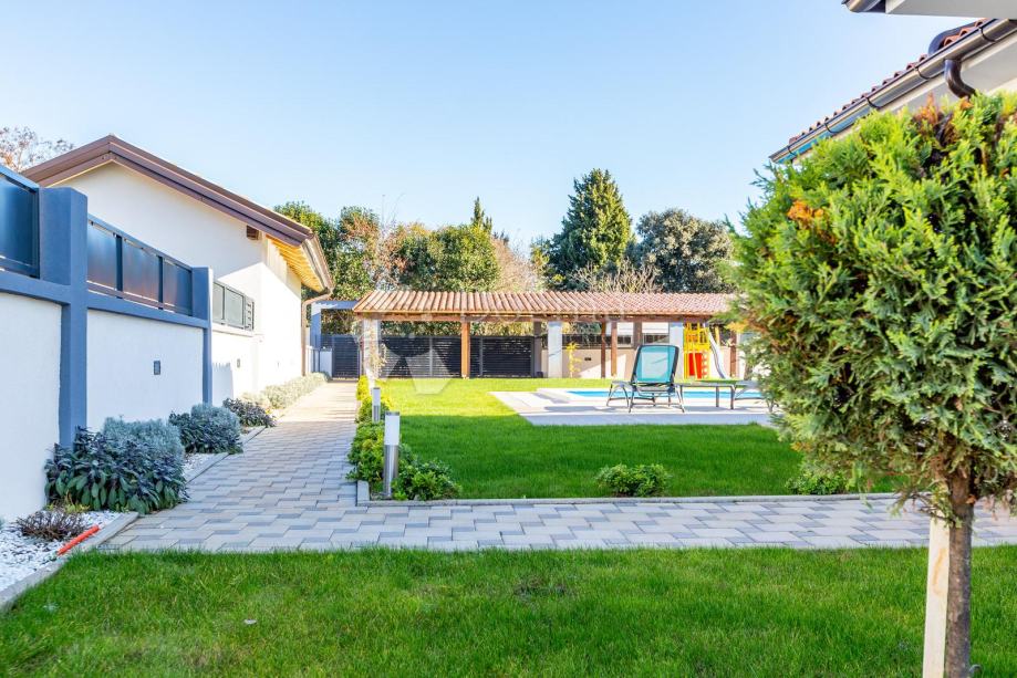 Vila se prodaje kompletno namještena sa svim soficticiranim uređajima, osiguranim natkrivenim parkirnim mjestima, dvorištem, roštiljem, vrtnom kućicom, igralištem za djecu, saunom, fitness, stolnim tenisom, tušem uz bazen.