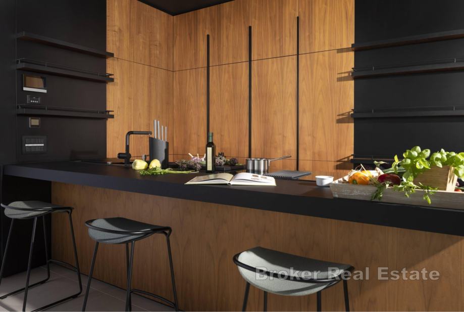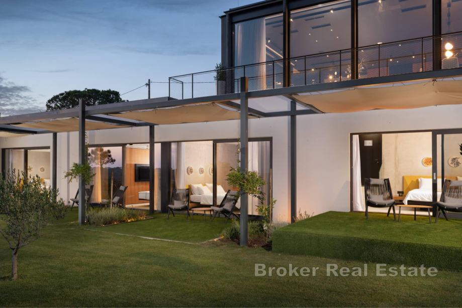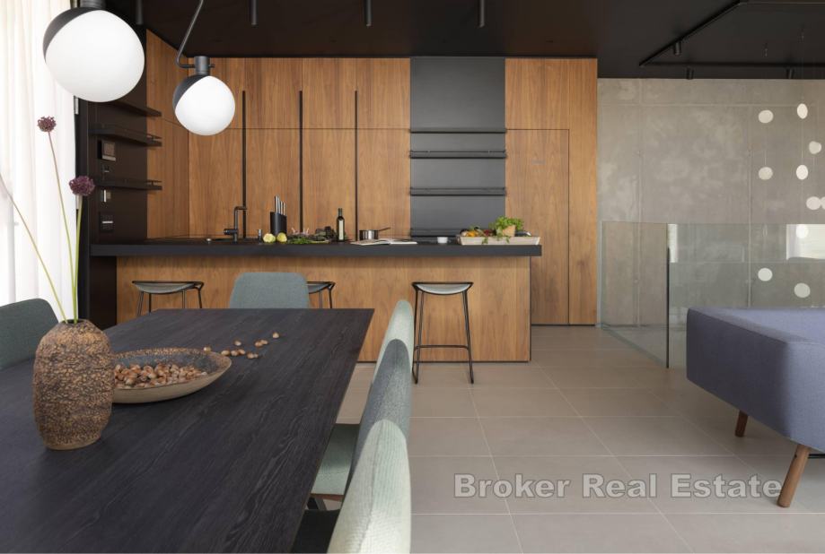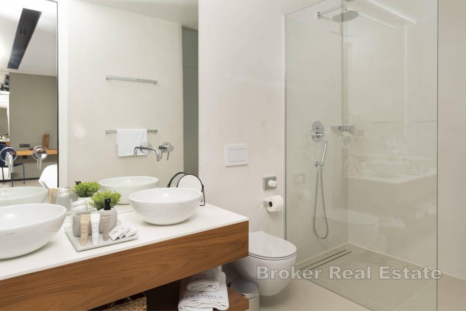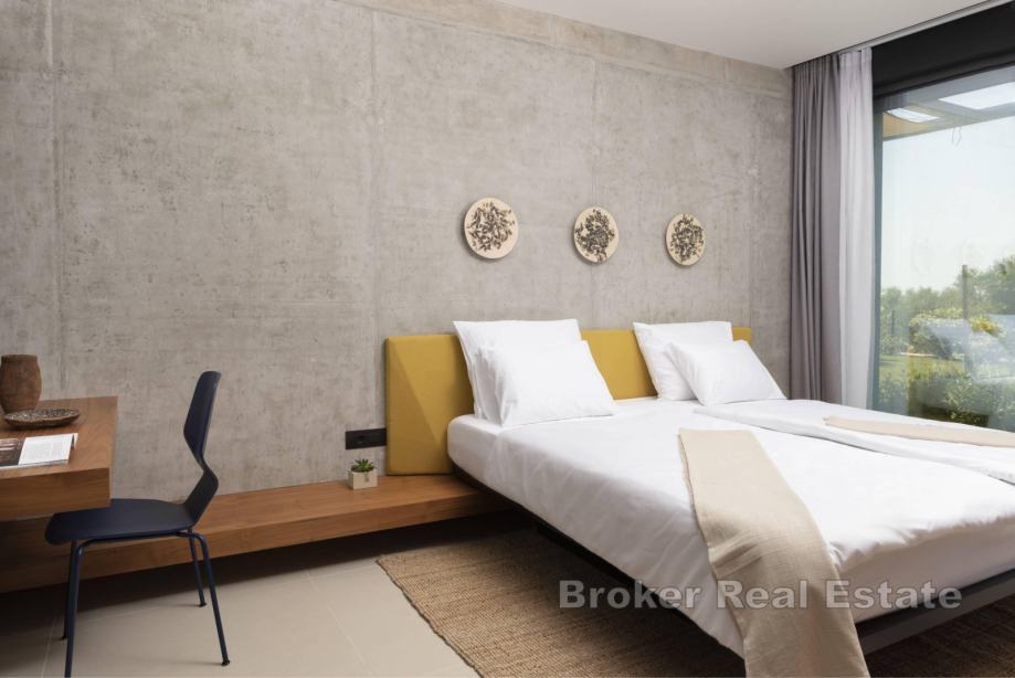 – Glavna centralna vila 560m2 modernističke arhitekture dominira posjedom. Koncipirana je kao kompleks dviju sestrinskih vile međusobno povezanih podrumskom etažom.Njen moderno dizajniran interijer, prozračnost i osunčanost, klimatizirane prostorije s podnim grijanjem garant su vrhunskog boravka tijekom cijele godine.