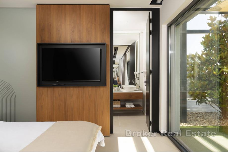 Vila se sastoji od 9 prostranih soba s vlastitim kupaonicama, dva dnevna boravka s kuhinjom i blagovaonicom, dva vanjska bazena s sunčalištem te relaks zonom s teretanom i parnom kupelji.