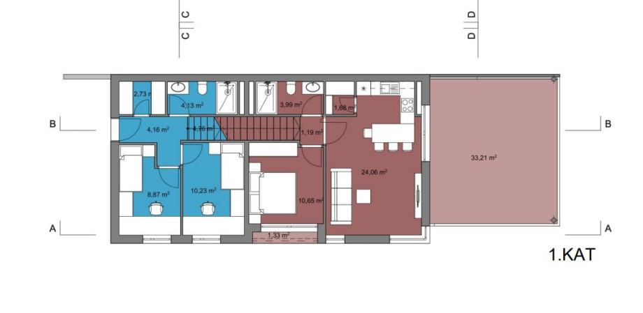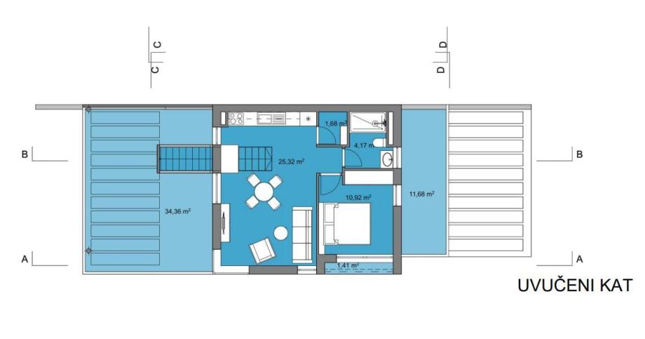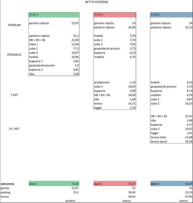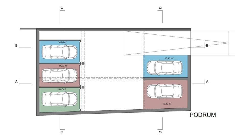 Projektirana su 2 objekta pri čemu svaki sadrži 3 stana sa zasebnim ulazom te pripadajućim vrtom i podzemnim parkirnim mjestom.