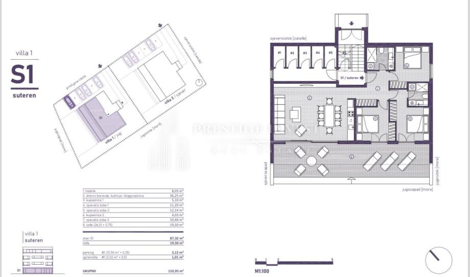Stan S1 -suteren - 110,95m2 - Predivan pogled – Villa 1- Stan S1 nalazi se u suterenu, te je ukupne neto površine 110,95m2. Stan se sastoji od prostranog otvorenog prostora kuhinje, blagovaonice i dnevnog boravka,3 spavaće sobe, 2 potpuno opremljene kupaonice, hodnika i loggie. Uz to stanu pripada i spremište te parkirno mjesto.