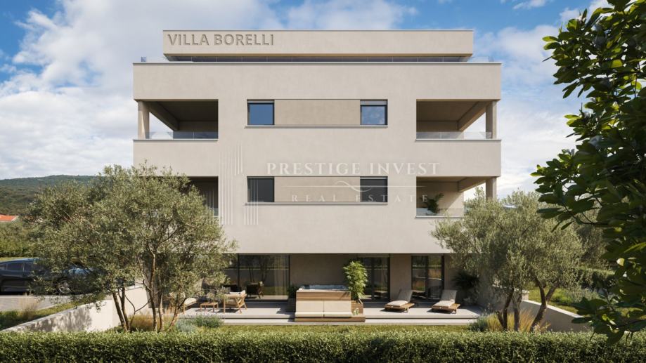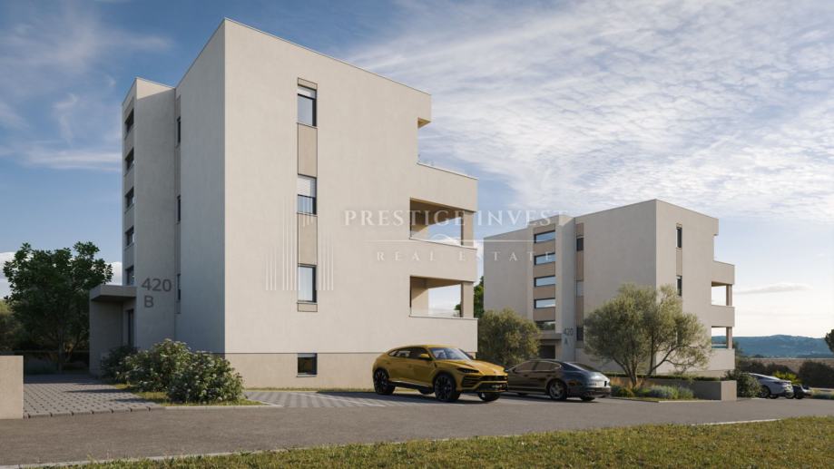 Od materijala korištenih prilikom gradnje i opremanja stanova izdvajamo: - Konstrukcija objekta od armiranog betona - Fasada: etics Baumit EPS debljine 12cm, krovna izolacija 20 cm - Vanjska stolarija: PVC 6-komorna s kvalitetnim okovima, staklo dvoslojno Low-e, aluminijske rolete s termoispunom, komarnici - Ulazna vrata u stanove: Protuprovalna protupožarna - Sobna vrata: Drvena vrata s puno krilom u boji te sveobuhvatnim štokom - Podne obloge: keramičke pločice 1.klase (talijanske i španjolske) većeg formata - Zidne obloge kupaonice: keramičke pločice 1.klase (talijanske i španjolske) većeg formata - Zidovi i stropovi završna obrada: fino gletanje i bojanje u bijeloj boji - Hlađenje i grijanje: inverter klime Samsung Wind-Free - potpuno opremljene kupaonice : ugradbeni WC kotlići Geberit, podžbukne slavine za tuš, tuš kade, sanitarije 1. klase, samostojeći ormarići sa umivaonikom i ogledalom, niskošumne odvodne cijevi - Parkiralište obloženo Semmelrock opločnicima; - Svaki stan ima jedno parkirališno mjesto i spremište u suterenskoj etaži - 80 m od mora i plaže - Pogled na more iz svakog stana Predviđen završetak radova je ožujak 2025.
