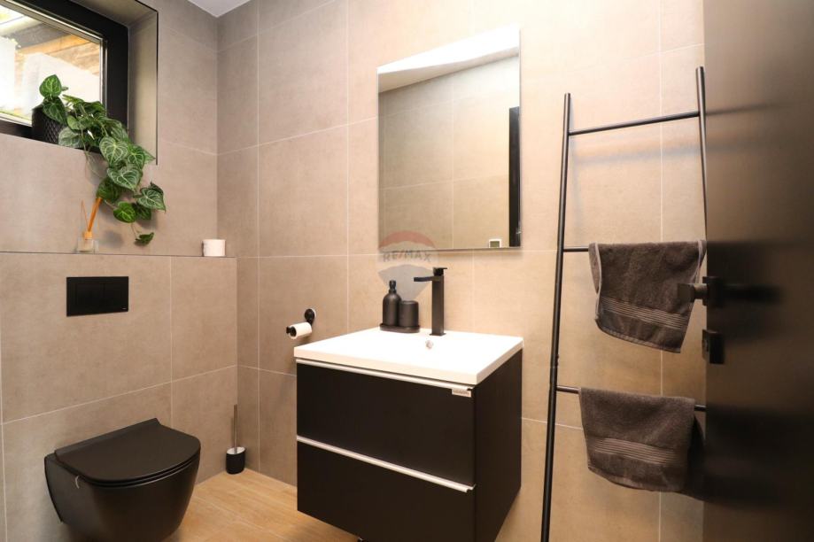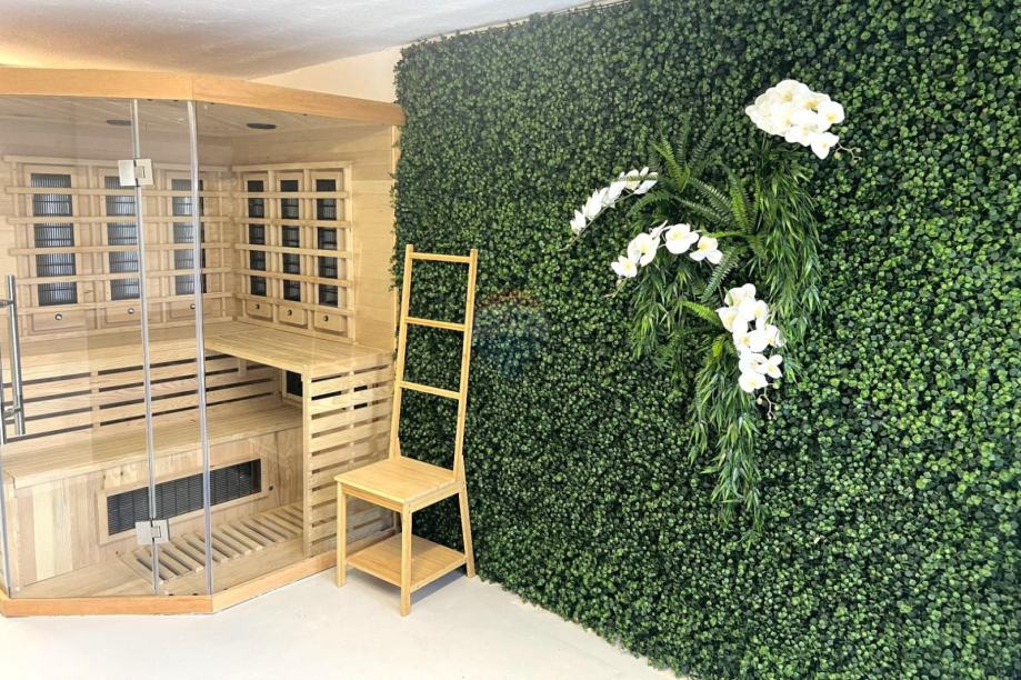 Za uživanje u zimi tu je podno grijanje i kamin s podiznim staklom u dnevnom boravku. Ugrađena su tri klima uređaja. Kuća je nisko energetska s ventiliranom fasadom. Veliki grijani bazen (50m2) sa slanom vodom ima sustav automatskog održavanja elektrolizom bez kemikalija. U prostoriji s infracrvenom saunom nalazi se prostor praonice i dodatni toalet. U garaži je punionica za električna vozila a ulazna vrata kao i vrata ograde otvaraju se daljinskim.