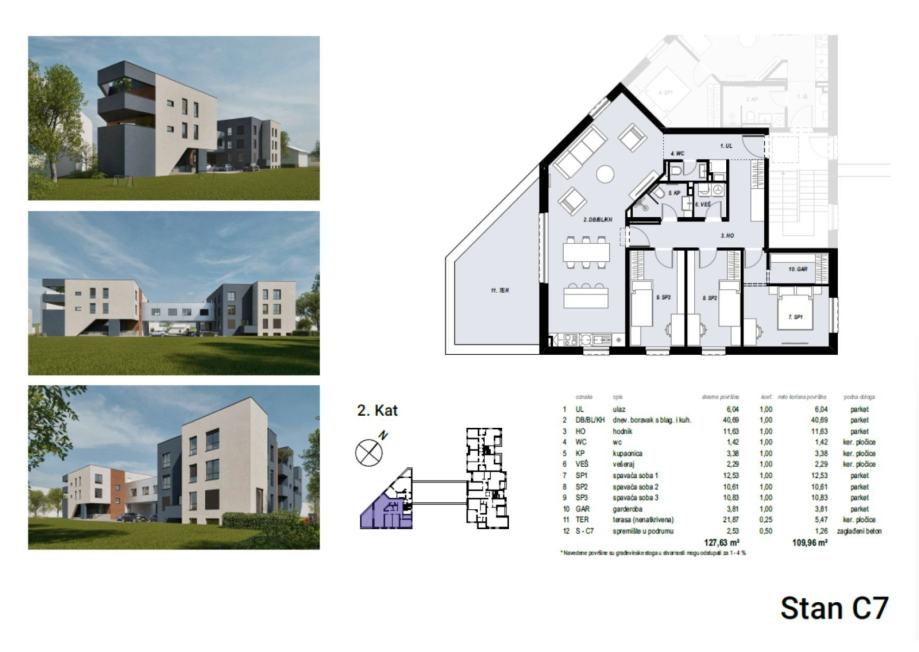 Stan C7 nalazi se u prizemlju zgrade i prostire se na 109,96 m2 neto površine. Sastoji se od zatvorenog dijela, veličine 103,23 m2, odnosno od ulaznog hodnika, dnevnog boravka s blagovaonicom i kuhinjom, dvije spavaće sobe, kupaonice te terase, veličine 21,87 m2. Stanu pripada i spremište u podrumu veličine 2,53 m2.