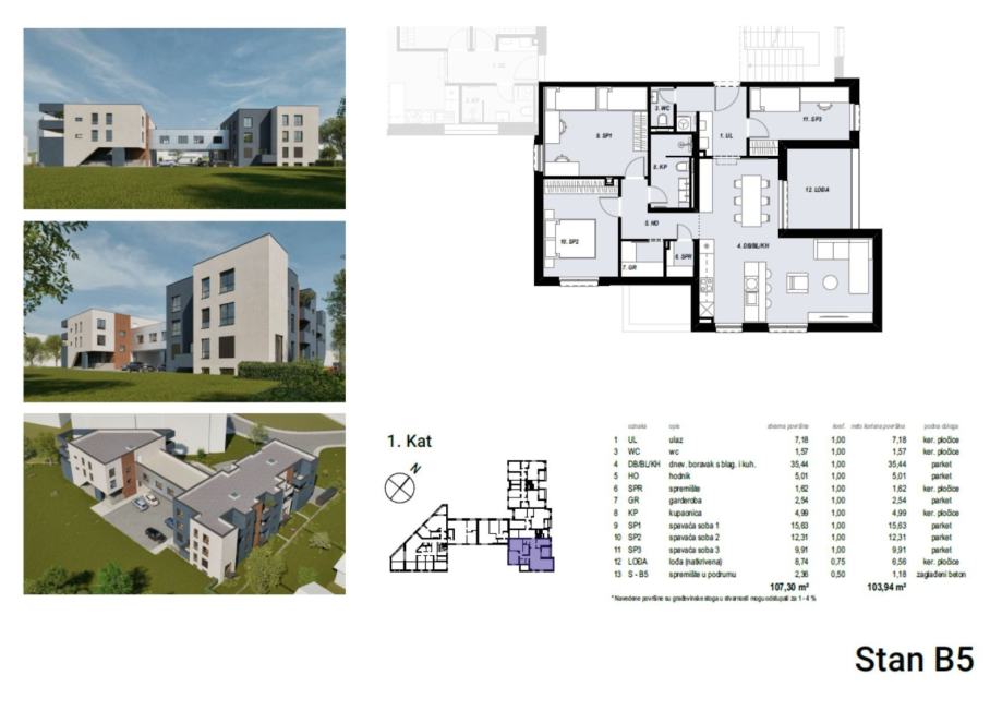 Stan B5 nalazi se na 1 katu zgrade i prostire se na 103,94 m2 neto površine. Sastoji se od zatvorenog dijela, veličine 96,20 m2, odnosno od ulaznog hodnika, dnevnog boravka s blagovaonicom i kuhinjom, tri spavaće sobe, kupaonice te lođe, veličine 8,74 m2. Stanu pripada i spremište u podrumu veličine 2,36 m2.