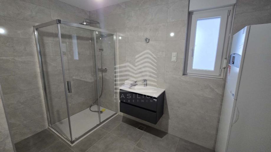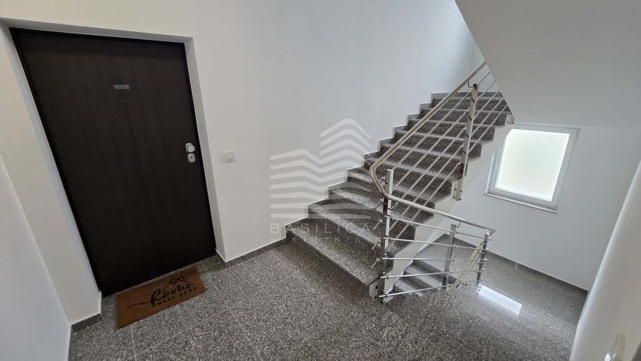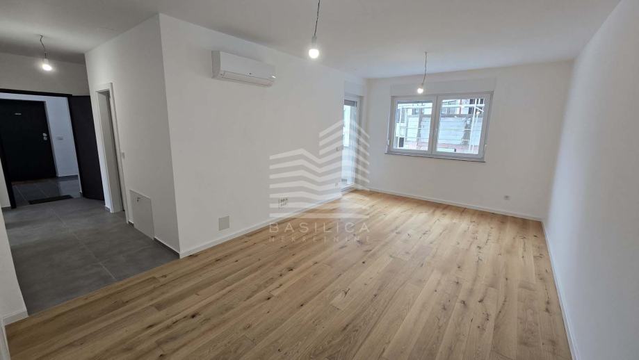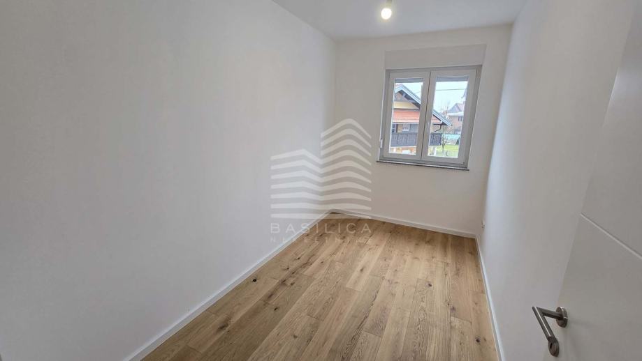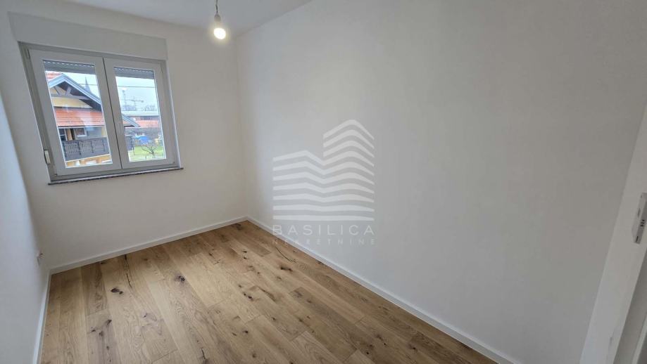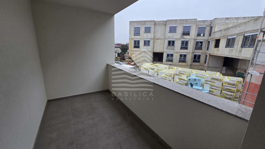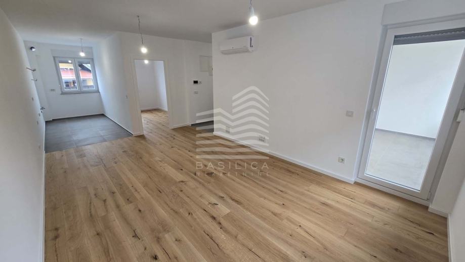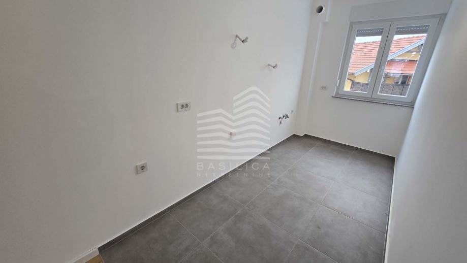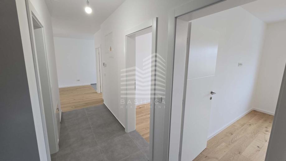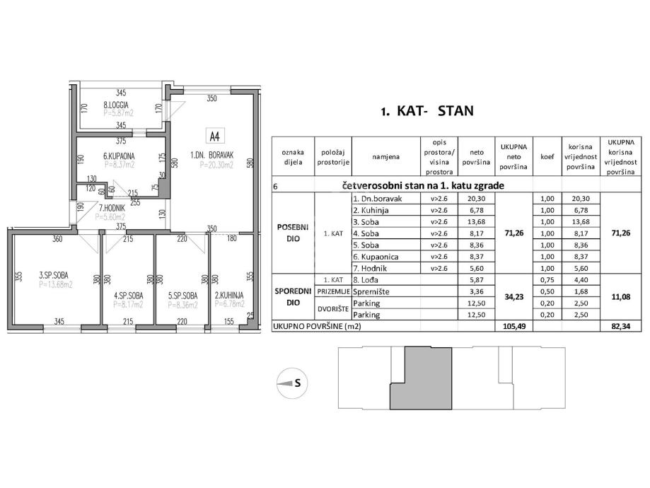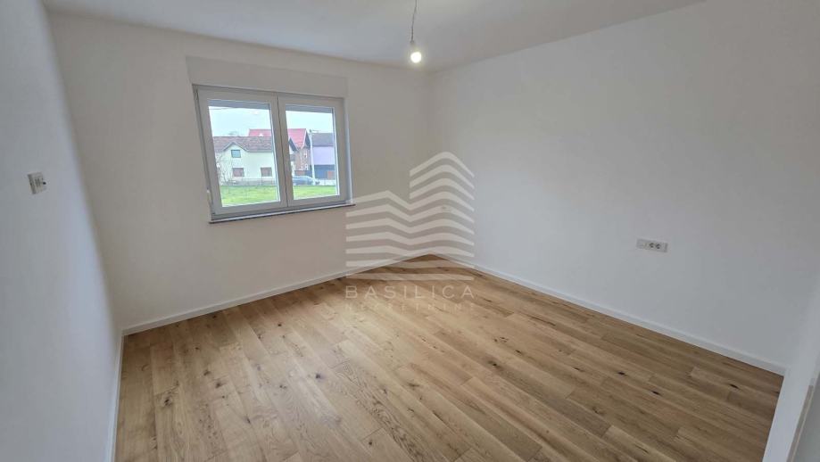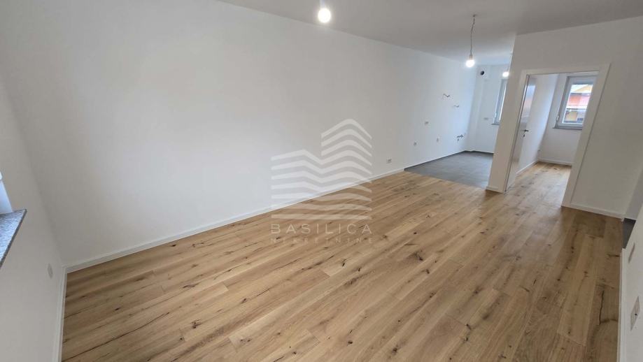 Zgrada je dovršena gradnja 2025.g., te se radi o novom, useljivom stanu. Sastoji se od prizemlja i 2 kata. Stan se nalazi na 1. katu, četverosoban, te se sastoji od: hodnik (5,60m2), dnevni boravak sa kuhinjom i blagovaonicom (27,08m2), soba (13,68m2), soba (8,17m2), soba (8,36m2), kupaonica (8,37m2), ukupne stambene površine 71,26, lođe od 5,87m2 (obračunski 4,40m2), spremište u prizemlju zgrade od 3,36m2 (obračunski 1,68m2), te dva vanjska parkirna mjesta od 12,50m2 svako (obračunski 5m2). Ukupna prodajna površina je 82,34m2.