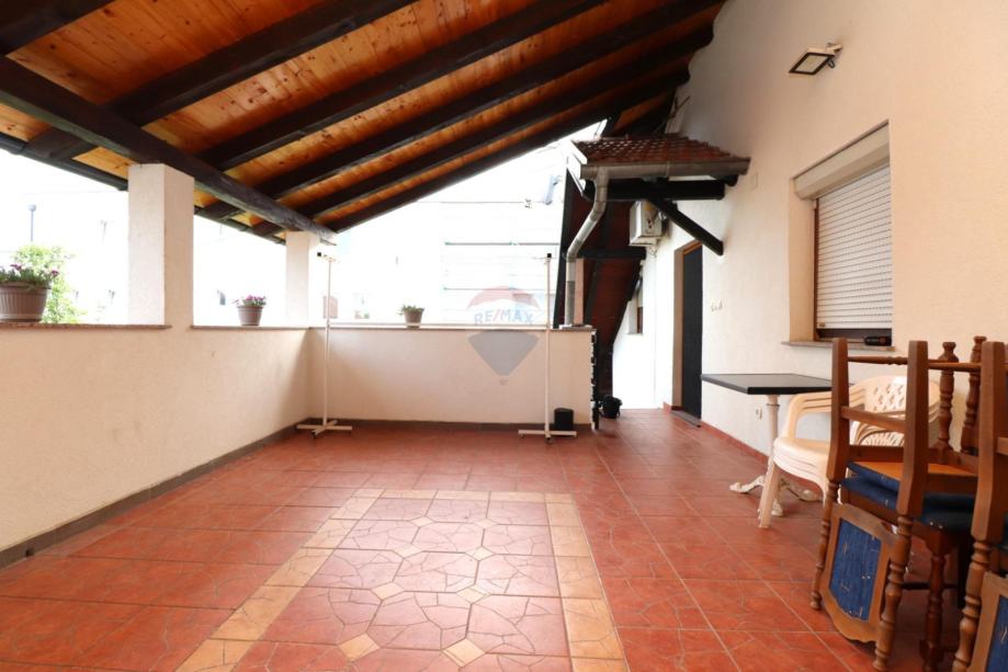 Vanjska natkrivena terasa je vrlo prostrana i iskoristiva s površinom od 30m2. U dvorištu se nalazi zajednički uređeni vrt, prostor za parkiranje i pripadajuće spremište.