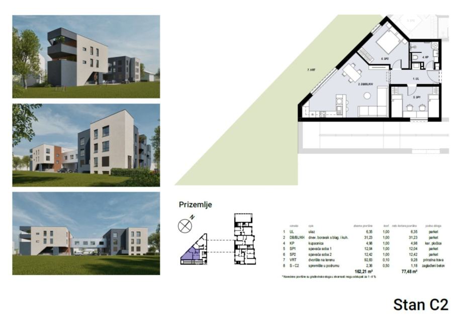 Stan C2 nalazi se u prizemlju zgrade i prostire se na 77,48 m2 neto površine. Sastoji se od zatvorenog dijela, veličine 67 m2, odnosno od ulaznog hodnika, dnevnog boravka s blagovaonicom i kuhinjom, dvije spavaće sobe, kupaonice te vrta, veličine 92,83 m2. Stanu pripada i spremište u podrumu veličine 2,36 m2.