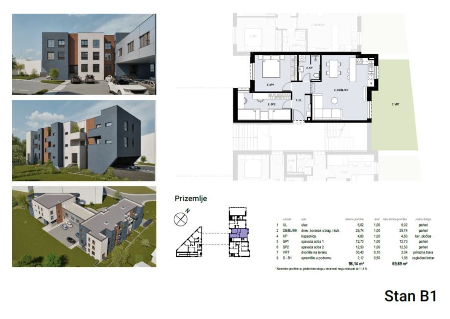Stan B1 nalazi se u prizemlju zgrade i prostire se na 69,69 m2 neto površine. Sastoji se od zatvorenog dijela, veličine 65,59 m2, odnosno od ulaznog hodnika, dnevnog boravka s blagovaonicom i kuhinjom, dvije spavaće sobe, kupaonice te vrta, veličine 30,43 m2. Stanu pripada i spremište u podrumu veličine 2,55 m2.