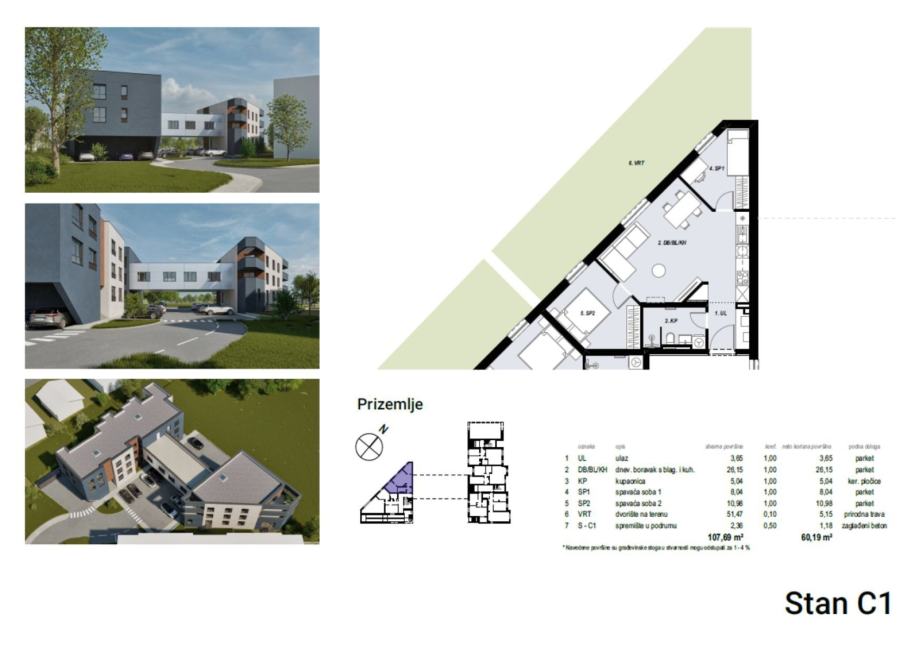 Stan C1 nalazi se u prizemlju zgrade i prostire se na 60,19 m2 neto površine. Sastoji se od zatvorenog dijela, veličine 53,86 m2, odnosno od ulaznog hodnika, dnevnog boravka s blagovaonicom i kuhinjom, dvije spavaće sobe, kupaonice te vrta, veličine 51,47 m2. Stanu pripada i spremište u podrumu veličine 2,36 m2.