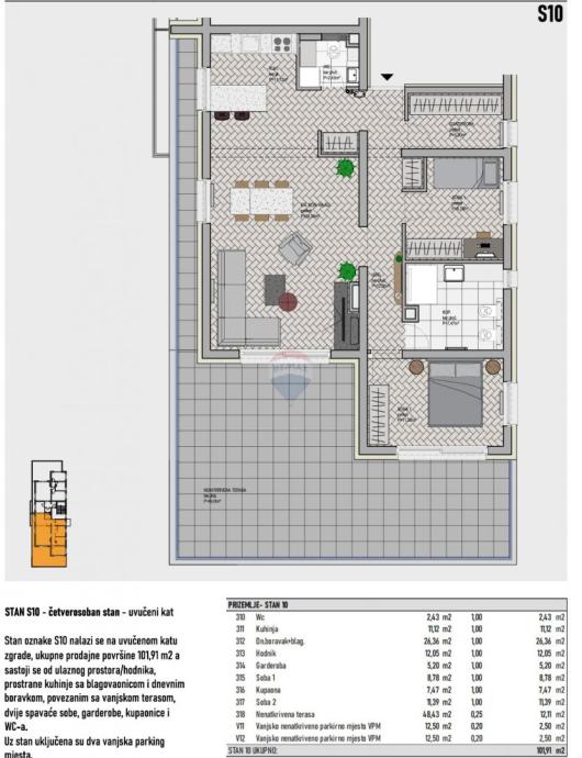 Prodaje se stan (S10) ukupne površine 108,19 m2 koji se nalazi na drugom katu novogradnje s ukupno dva kata bez lifta.