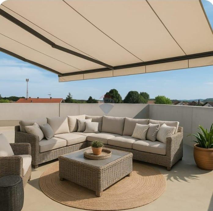 Predmetni stan sastoji se od ulaznog prostora/hodnika, prostrane kuhinje s blagovaonicom i dnevnim boravkom (open space), povezanim s vanjskom terasom,