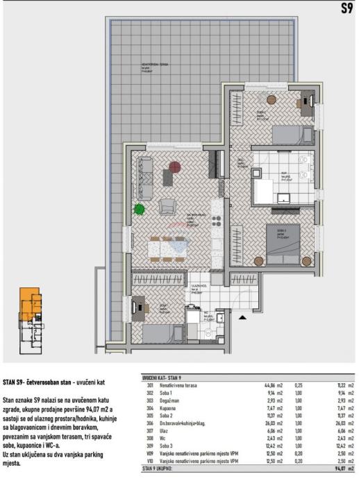 Prodaje se stan (S9) ukupne površine 110,80,07 m2 koji se nalazi na drugom katu novogradnje s ukupno dva kata bez lifta.
