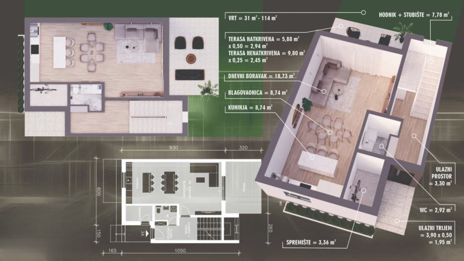blagovaonica, dnevni boravak, natkrivena terasa površine 5,88 m2 ( neto 2,94 m2), nenatkrivena terasa površine 9,80 m2 ( neto 2,45 m2)