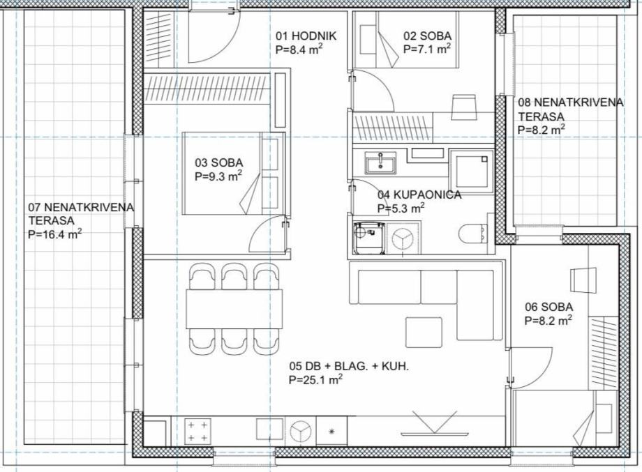Moderno osmišljeni Četverosoban stan ima površinu od 63 m² , terasu površine 25 m2 te uključuje vlastito parkirno mjesto površine 15 m² — uključeno u cijenu!