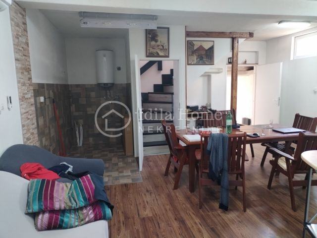 površine 46 m2, poluetaže od pet stepenica na kojoj se nalazi dnevni boravak s kuhinjom i spremištem,