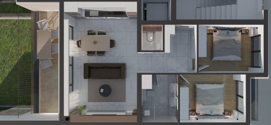 Stambena korisna površina stana S6 na prvom katu iznosi 77,87 m2, a sastoji se od: hodnika, dvije spavaće sobe, kupaonice, kuhinje s blagovaonicom i dnevnim boravkom, WC-a, balkona, lođe, parkirnog mjesta i vanjskog spremišta.