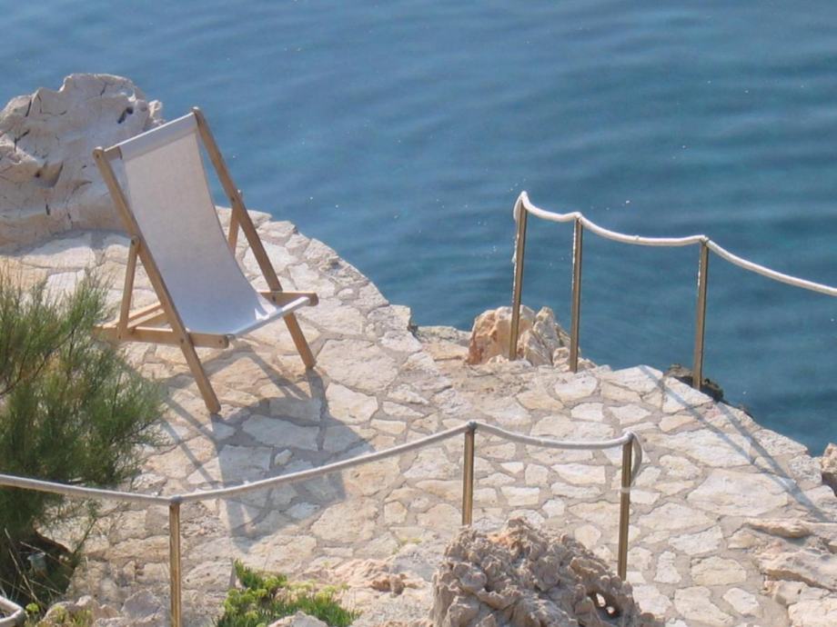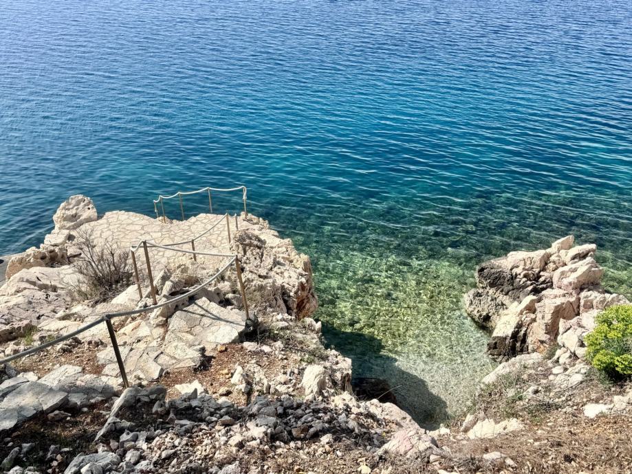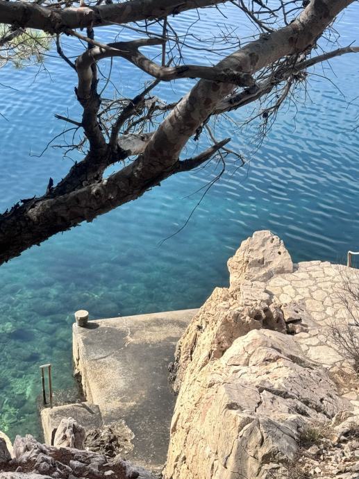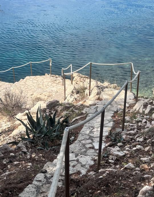 Prema moru vodi stazica sa platoom za sunčanje i dalje prema samoj obali mora sa malom plažom kojeg koriste stanari kuće.